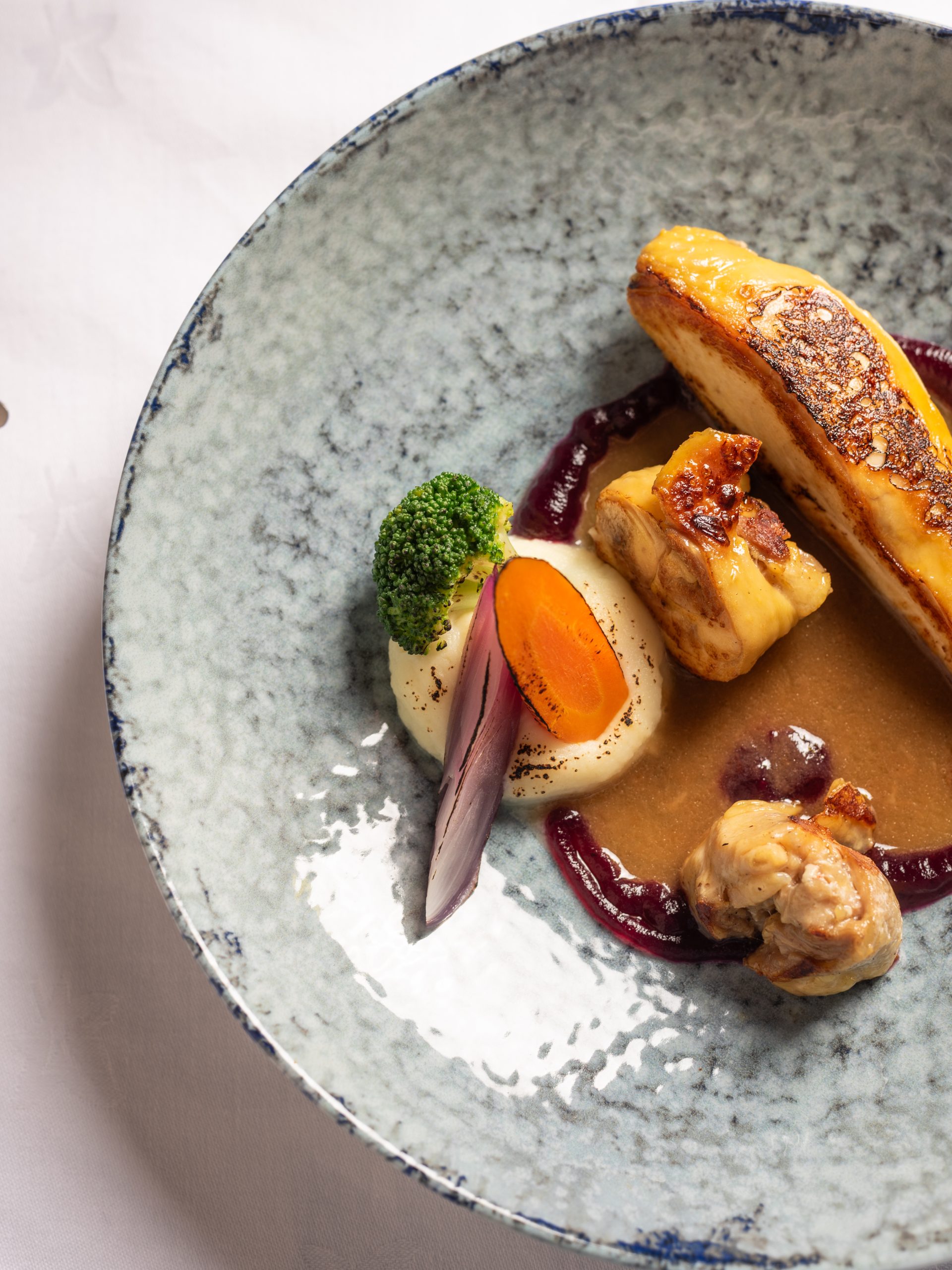 Gallina confit croccante, gel alla barbabietola e verdurine