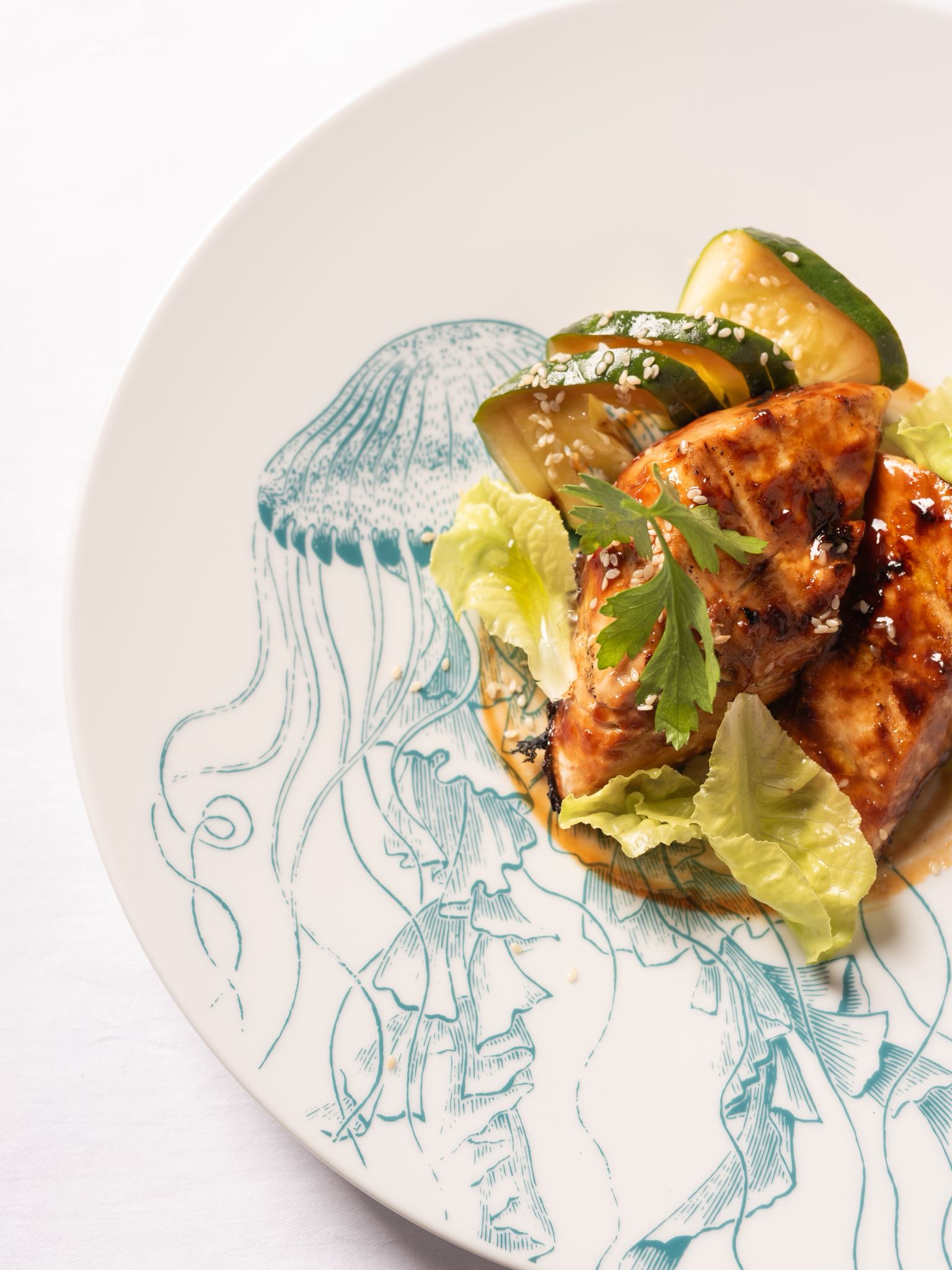 Ricciola laccata alla salsa Tonkatsu con insalatina di cetrioli marinati con soia e sesamo